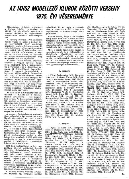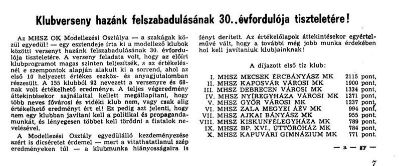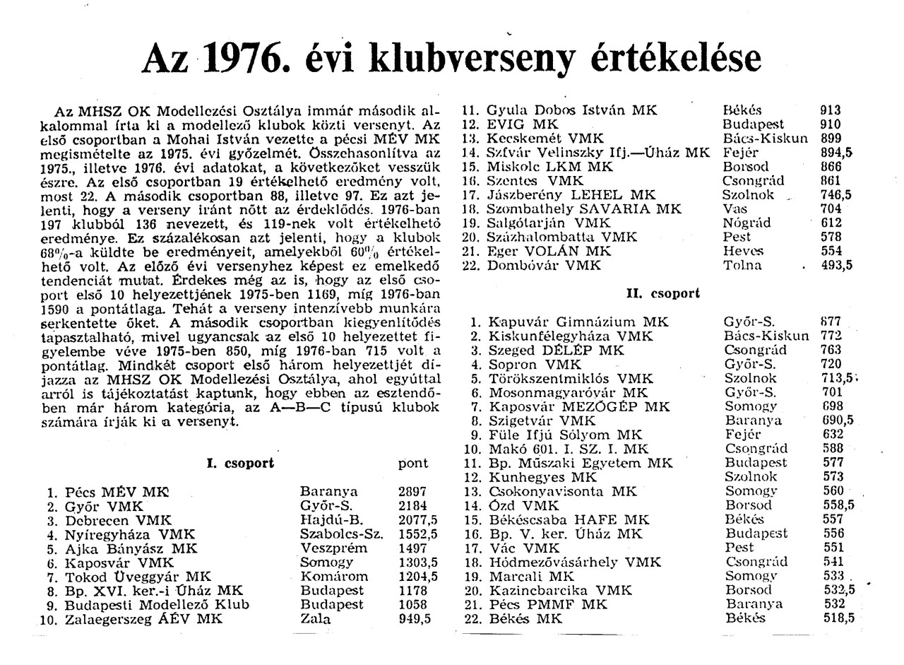 (1973) I. RUSITS LÁSZLÓ II. NAGY JÁNOS Úttörő Olimpia Kaposváron (1974) II. NAGY JÁNOS Versenyt hirdettek az ország összes modellező klubja részére: 155 klubból 92 nevezett be a versenybe, közöttük értük el a 9. helyezést! Úttörő Olimpián Szombathelyen (1975) II. ifj. MECZNER ANDRÁS Országos verseny-sorozatot hirdettünk, meg is nyertük (1975) Országos klub-versenyben - a II. csoportban (NB2) – a HARMADIK helyezést értük el! (1975) Az országos klub-versenyben - már az I. csoportban (NB1.) nyolcadikok lettünk! (1976) Ifjúsági Országos Bajnokságot MÉSZÁROS LÁSZLÓ nyerte. (1977) Októberben (1977) vettük át SAJÁT MIKROBUSZUNKAT Új verseny-számot találtunk ki gyerekeknek: Az elektromos távirányítású autómodelleket (1978) Az elektromos autómodellekről TV riport is készült [1 2 3](1979) Közgyűlésünk résztvevői. [1 2] (1979) Mi rendeztük a Szabadonrepülő Modellek Országos Bajnokságát. (1980) |